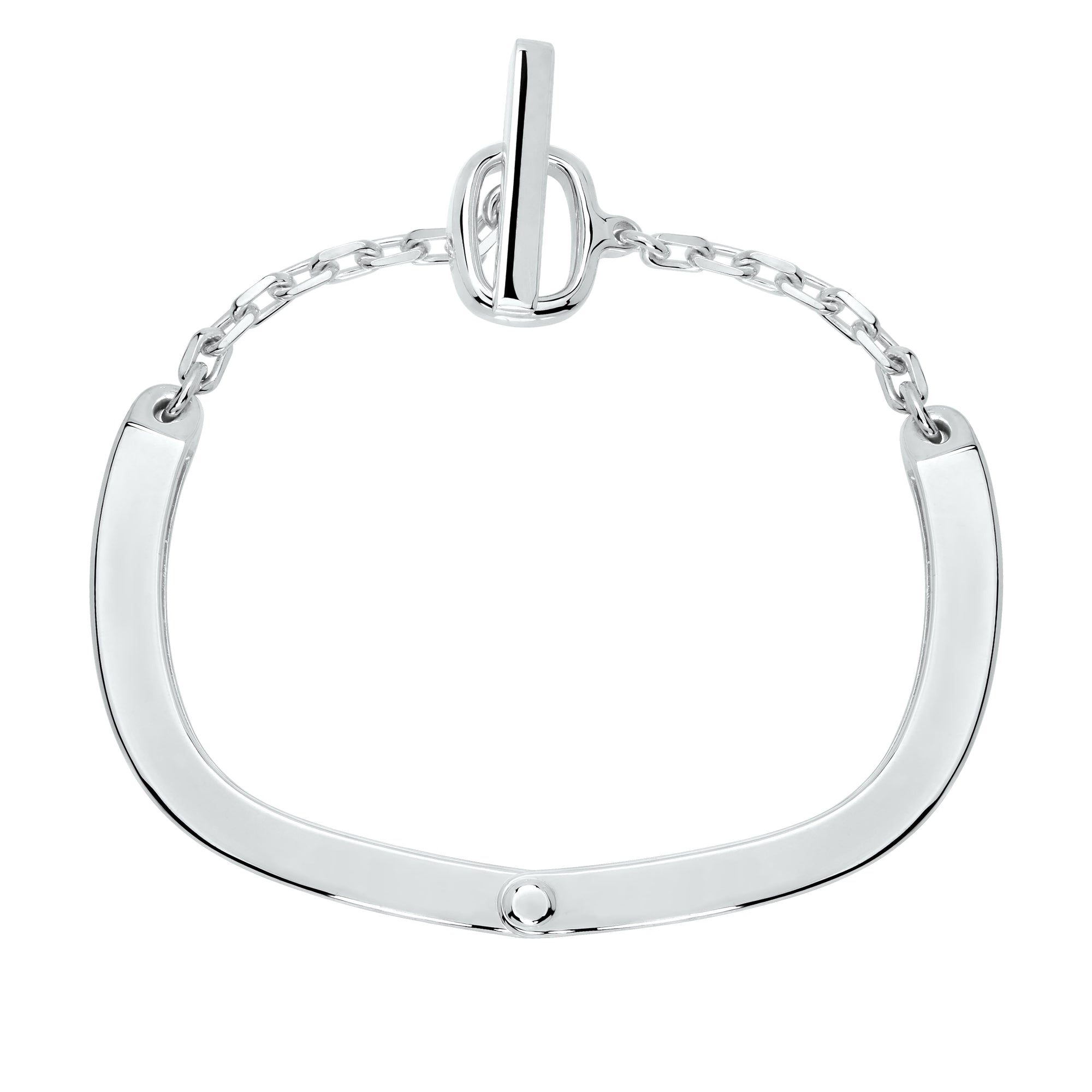 A custom oval toggle clasp, designed to echo the geometry of both the cuff and the chain. Seamlessly integrated, the closure feels intentional and architectural—an extension of the bracelet rather than an afterthought. A study in function, form, and motion, Pivot is built to flex without losing its edge.